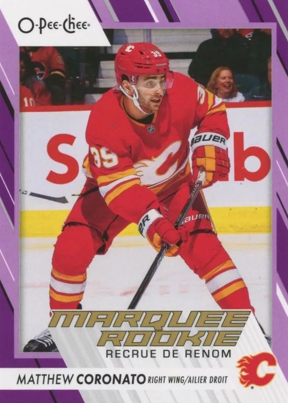 This card is 1 of 14 Matthew Coronato's card variations in the 2023 O-Pee-Chee set being tracked by Sports Card Investor, including Marquee Rookies, Marquee Rookies - Blue Border, Marquee Rookies - Red Border, Marquee Rookies - Retro, and Marquee Rookies - Retro Blank Back.