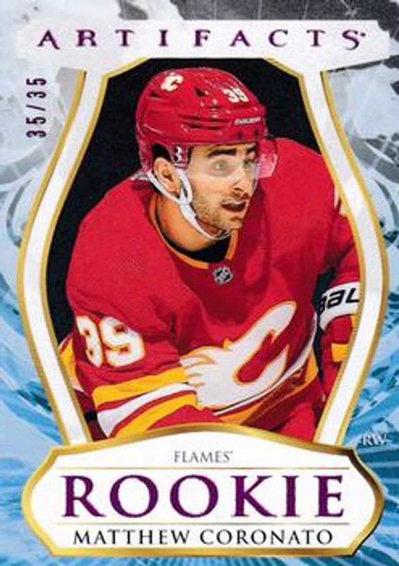 The Matthew Coronato 2023 Upper Deck Artifacts #171 Pink /35 Rookie card is 1 of 28 Matthew Coronato's card variations in the 2023 Upper Deck Artifacts set being tracked by Sports Card Investor, including Base /999, Leather, Plexi, Turquoise, and Wood.