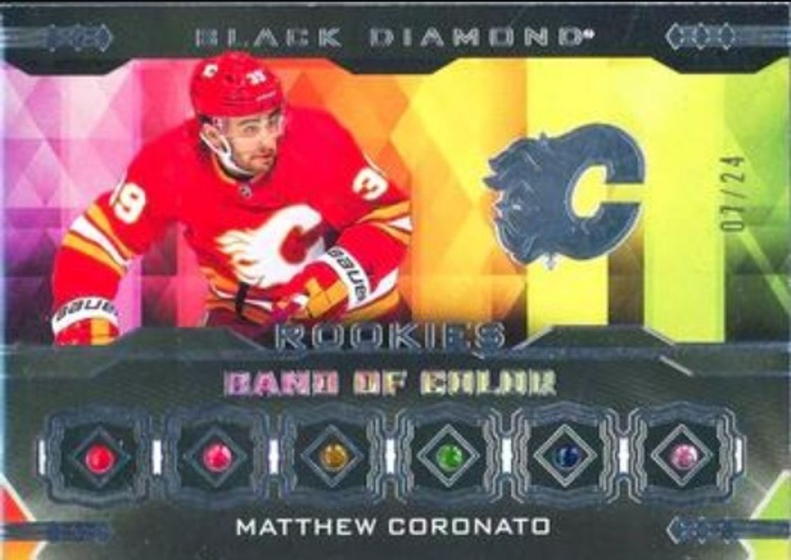 The Matthew Coronato 2023 Upper Deck Black Diamond #BCR-MC Band of Color Rookies /24 card is 1 of 60 Matthew Coronato's card variations in the 2023 Upper Deck Black Diamond set being tracked by Sports Card Investor, including Base /349, Red /75, Blue /25, Pure Black Auto /25, and Green /10.