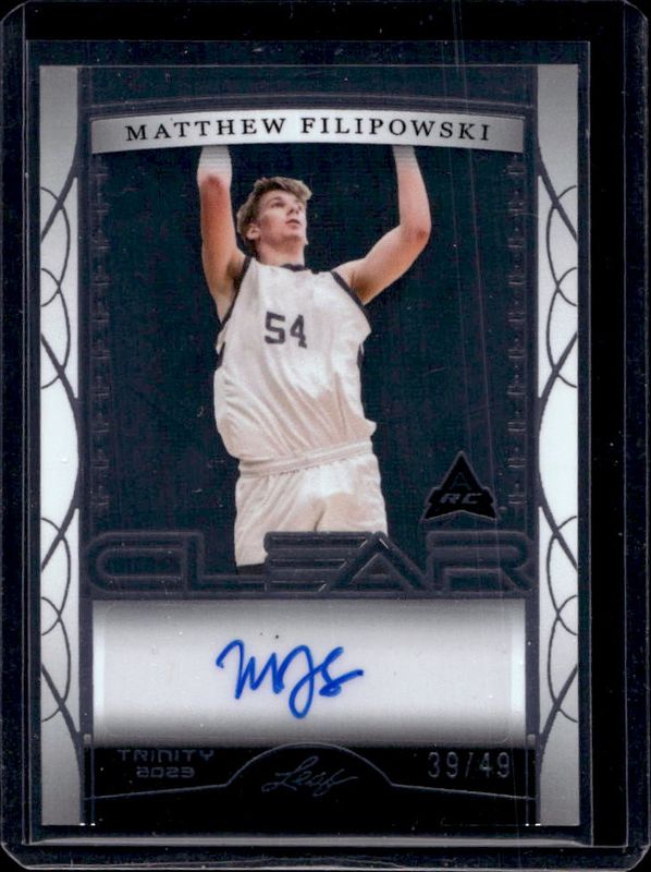 The Matthew Filipowski 2022 Leaf Trinity #CA-MF1 Clear Auto - Silver /49 card is 1 of 18 Matthew Filipowski's card variations in the 2022 Leaf Trinity set being tracked by Sports Card Investor, including Base /49, Gold /35, Blue /30, Holo Platinum /25, and Holo Green /20.