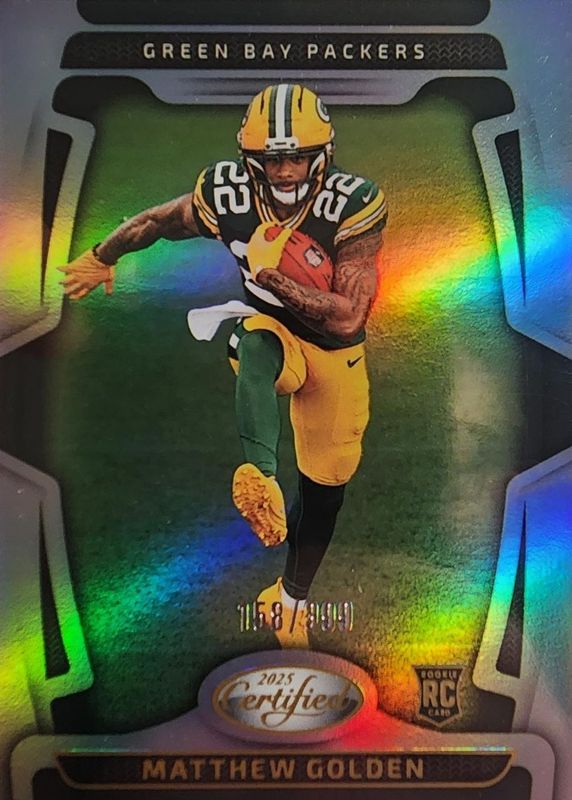 This card is 1 of 102 Matthew Golden's card variations in the 2025 Certified set being tracked by Sports Card Investor, including Base Rookie /499, Mirror Purple /299, Mirror Pink /225, Mirror Orange /150, and Mirror Red /100.