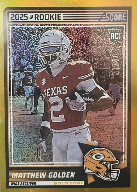The Matthew Golden 2025 Score #56 Gold Zone /50 Rookie card in Raw condition has not changed in price in the last 30 days and was last sold for $38.00 .