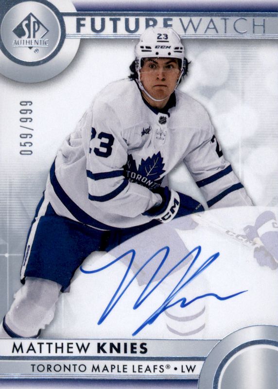 This card is 1 of 3 Matthew Knies' card variations in the 2023 SP Authentic set being tracked by Sports Card Investor, including Future Watch Auto - Mystery Black, and Future Watch Auto - Inscriptions /50.