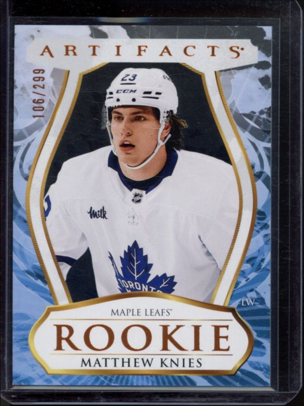 The Matthew Knies 2023 Upper Deck Artifacts #200 Copper /299 Rookie card is 1 of 38 Matthew Knies' card variations in the 2023 Upper Deck Artifacts set being tracked by Sports Card Investor, including Base /999, Leather, Plexi, Turquoise, and Wood.