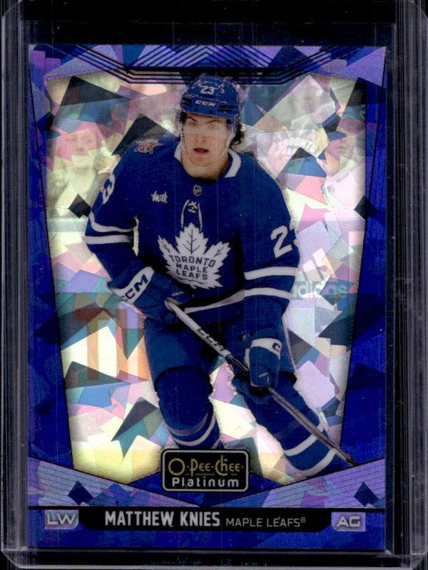 The Matthew Knies 2024 O-Pee-Chee Platinum #70 Blue Fragments /125 card is 1 of 15 Matthew Knies' card variations in the 2024 O-Pee-Chee Platinum set being tracked by Sports Card Investor, including Base, Neon Yellow Surge, Pink Magma, Rainbow, and Sunset.