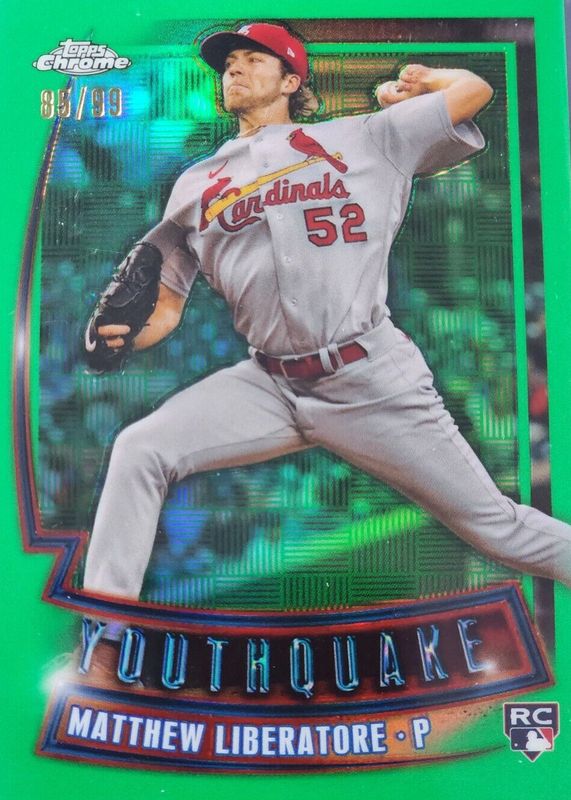 The Matthew Liberatore 2023 Topps Chrome #YQ-32 Youthquake - Green Refractor /99 Rookie card in Raw condition has not changed in price in the last 30 days and was last sold for $3.00 .