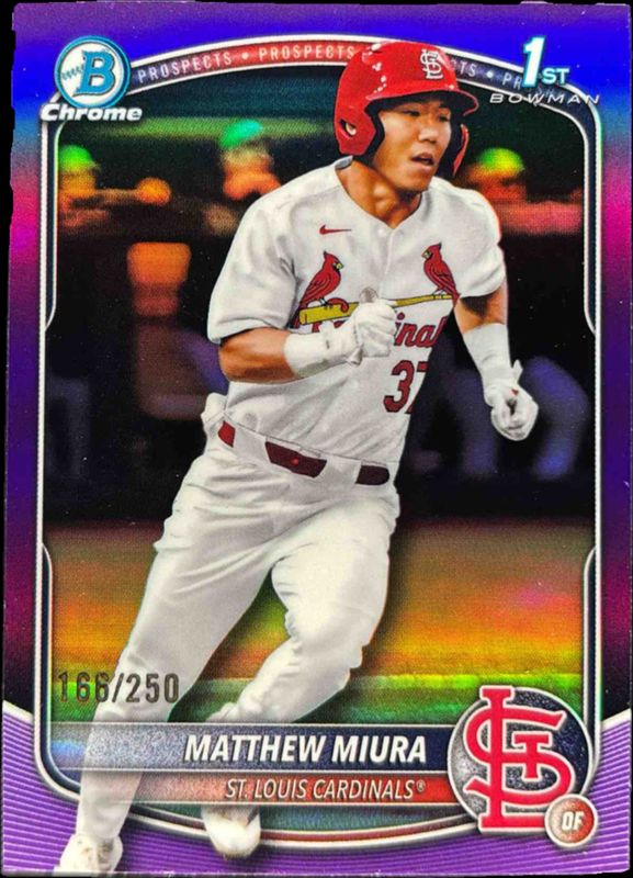 The Matthew Miura 2025 Bowman Draft #BDC-57 Chrome - Purple Refractor /250 card is 1 of 84 Matthew Miura's card variations in the 2025 Bowman Draft set being tracked by Sports Card Investor, including Base, Chrome, Chrome - Lazer Refractor, Chrome - Refractor, and Chrome - Sky Blue Refractor.