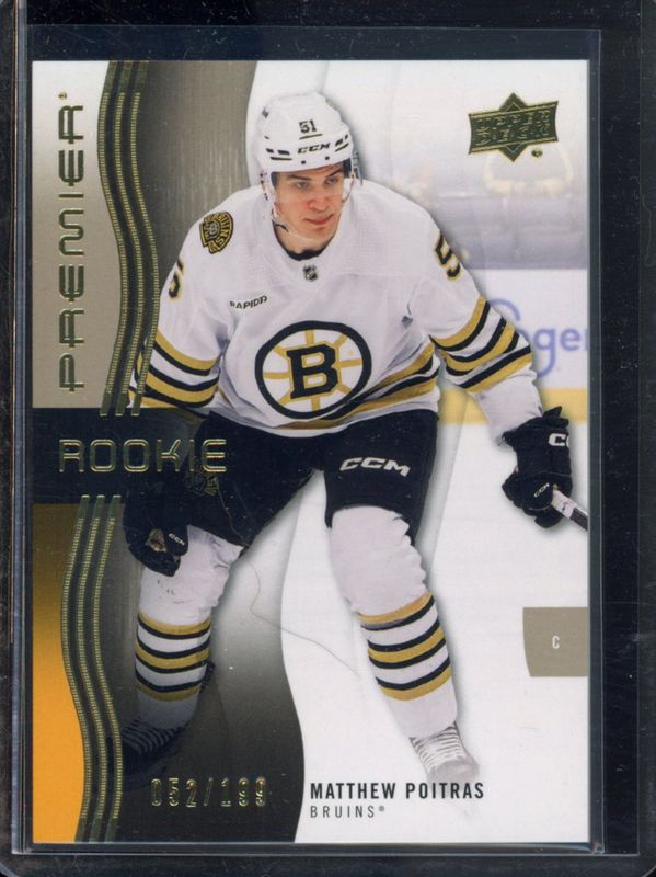 The Matthew Poitras 2023 Upper Deck Premier #107 Bronze /199 Rookie card is 1 of 33 Matthew Poitras' card variations in the 2023 Upper Deck Premier set being tracked by Sports Card Investor, including Base /399, Gold /65, Ruby /49, Rose Gold /25, and Fight Strap /15.