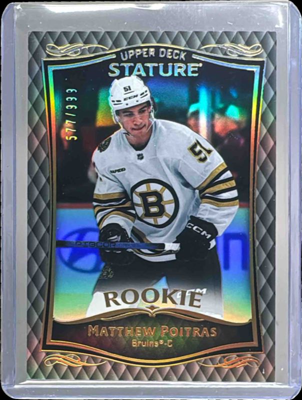 The Matthew Poitras 2024 Upper Deck Stature #41 2023-24 Base Rookies Update /999 card is 1 of 31 Matthew Poitras' card variations in the 2024 Upper Deck Stature set being tracked by Sports Card Investor, including 2023-24 Update Auto, 2023-24 Update - Black, 2023-24 Update - Blue, 2023-24 Update - Gold, and 2023-24 Update - Green.
