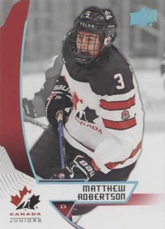 The Matthew Robertson 2019 Upper Deck Team Canada Juniors #14 Blue card is 1 of 20 Matthew Robertson's card variations in the 2019 Upper Deck Team Canada Juniors set being tracked by Sports Card Investor, including #14 Base, #135 Base, #14 Jersey Relics, #14 Premium Swatch Autographs /199, and #135 Exclusives /150.