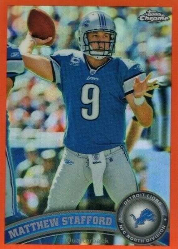 The Matthew Stafford 2011 Topps Chrome #4 Orange Refractor card in Raw condition has moved down -$4.95 (-49.7%) in the last 30 days and was last sold for $5.00 .