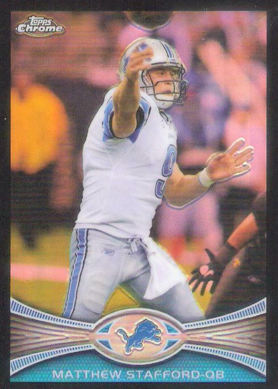 This card is 1 of 12 Matthew Stafford's card variations in the 2012 Topps Chrome set being tracked by Sports Card Investor, including Orange Refractor, Refractor, X-Fractor, Camo Refractor /499, and Purple Refractor /499.
