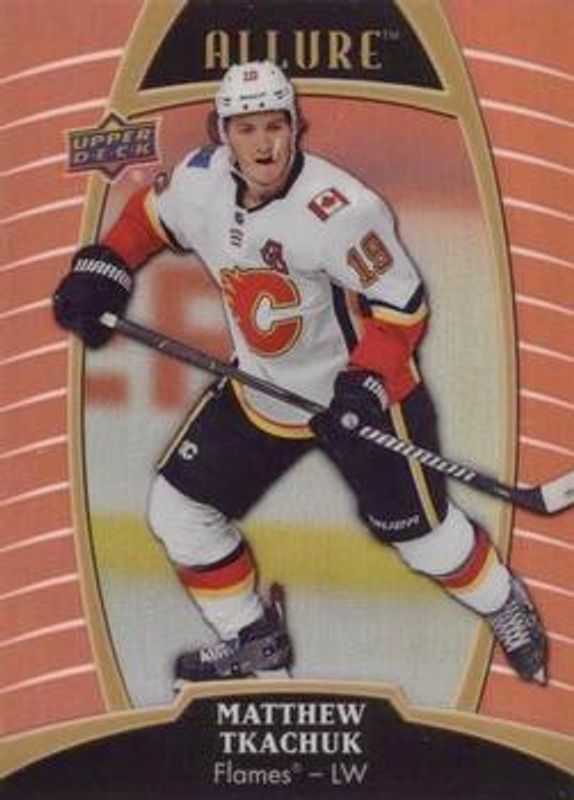 The Matthew Tkachuk 2019 Upper Deck Allure #26 Sunset card is 1 of 19 Matthew Tkachuk's card variations in the 2019 Upper Deck Allure set being tracked by Sports Card Investor, including Base, Pewter, Red Rainbow, White Rainbow, and Yellow Taxi.
