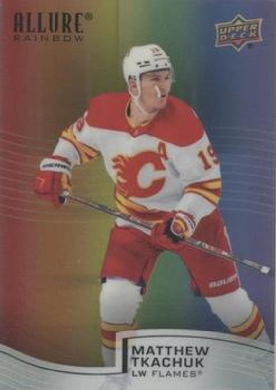 The Matthew Tkachuk 2021 Upper Deck Allure #R-98 Rainbow - Double Rainbow card is 1 of 43 Matthew Tkachuk's card variations in the 2021 Upper Deck Allure set being tracked by Sports Card Investor, including Base, Black Rainbow, Blue China, Orange Slice die-cut, and Pink Blue Leopard.