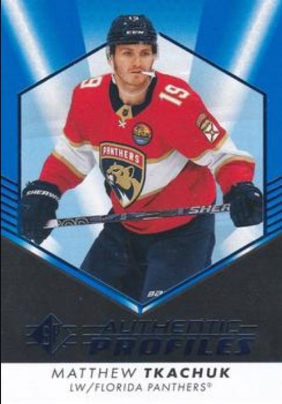 The Matthew Tkachuk 2022 SP #AP-4 Authentic Profiles - Blue card is 1 of 15 Matthew Tkachuk's card variations in the 2022 SP set being tracked by Sports Card Investor, including Base /399, Blue, Authentic Profiles Jersey, Authentic Profiles - Patterned Foilboard, and Authentic Profiles - Patterned Foilboard Gold.