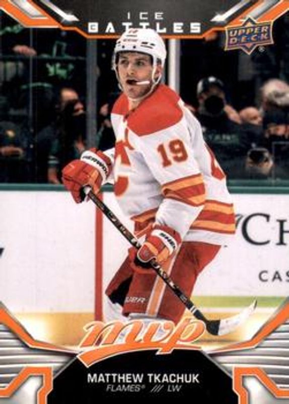 The Matthew Tkachuk 2022 Upper Deck MVP #206 Ice Battles card is 1 of 27 Matthew Tkachuk's card variations in the 2022 Upper Deck MVP set being tracked by Sports Card Investor, including Base, Blue Script, Gold Script, Silver Script, and Super Script /25.