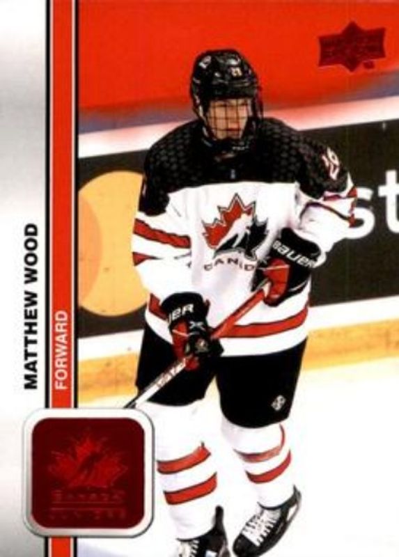 The Matthew Wood 2023 Upper Deck Team Canada Juniors #20 Red Foil card is 1 of 61 Matthew Wood's card variations in the 2023 Upper Deck Team Canada Juniors set being tracked by Sports Card Investor, including #140 Base, #99 Base, #20 Base, #146 Base, and #20 Clear Cut.