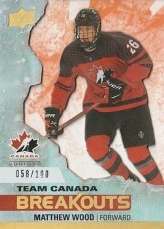 The Matthew Wood 2023 Upper Deck Team Canada Juniors #TCB-11 Team Canada Breakouts /100 card is 1 of 61 Matthew Wood's card variations in the 2023 Upper Deck Team Canada Juniors set being tracked by Sports Card Investor, including #140 Base, #99 Base, #20 Base, #146 Base, and #20 Clear Cut.