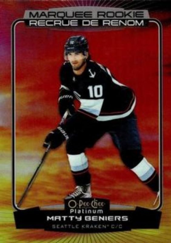 The Matty Beniers 2022 O-Pee-Chee Platinum #203 Sunset Rookie card is 1 of 46 Matty Beniers' card variations in the 2022 O-Pee-Chee Platinum set being tracked by Sports Card Investor, including Base, Matte Pink, Neon Yellow Surge, Rainbow, and Hot Magma /499.