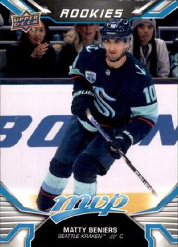 The Matty Beniers 2022 Upper Deck MVP #244 Base Rookie card is 1 of 17 Matty Beniers' card variations in the 2022 Upper Deck MVP set being tracked by Sports Card Investor, including Blue Script, Gold Script, Ice Battles, Silver Script, and Super Script /25.