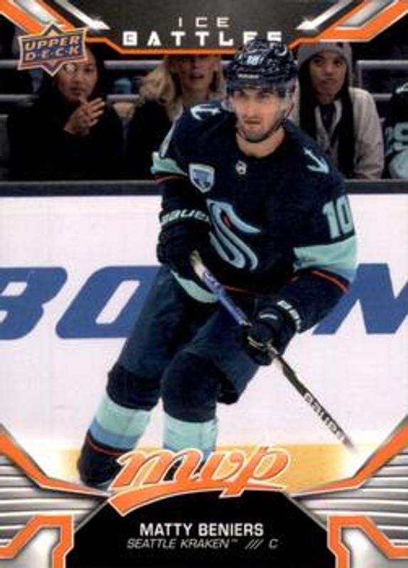 The Matty Beniers 2022 Upper Deck MVP #244 Ice Battles Rookie card is 1 of 17 Matty Beniers' card variations in the 2022 Upper Deck MVP set being tracked by Sports Card Investor, including Base, Blue Script, Gold Script, Silver Script, and Super Script /25.