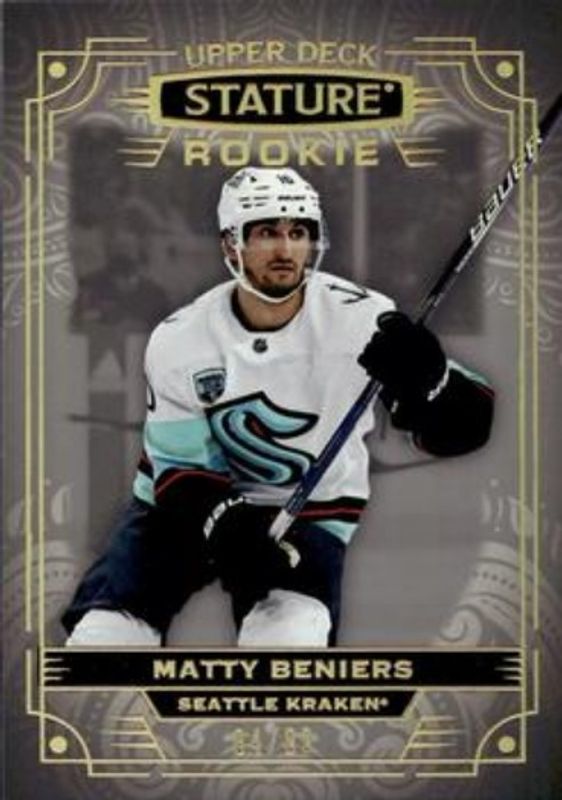 The Matty Beniers 2022 Upper Deck Stature #102 Photo Variant /99 Rookie card is 1 of 46 Matty Beniers' card variations in the 2022 Upper Deck Stature set being tracked by Sports Card Investor, including Base /399, Green /99, Red /75, Photo Variant Green /66, and Design Variant /65.