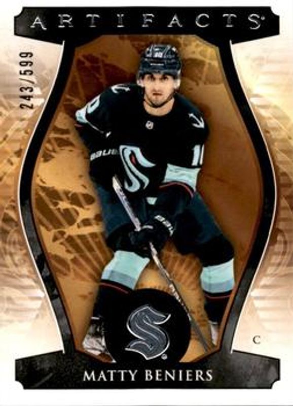 The Matty Beniers 2023 Upper Deck Artifacts #104 Base /999 card is 1 of 30 Matty Beniers' card variations in the 2023 Upper Deck Artifacts set being tracked by Sports Card Investor, including Leather, Plexi, Turquoise, Wood, and Ruby /499.