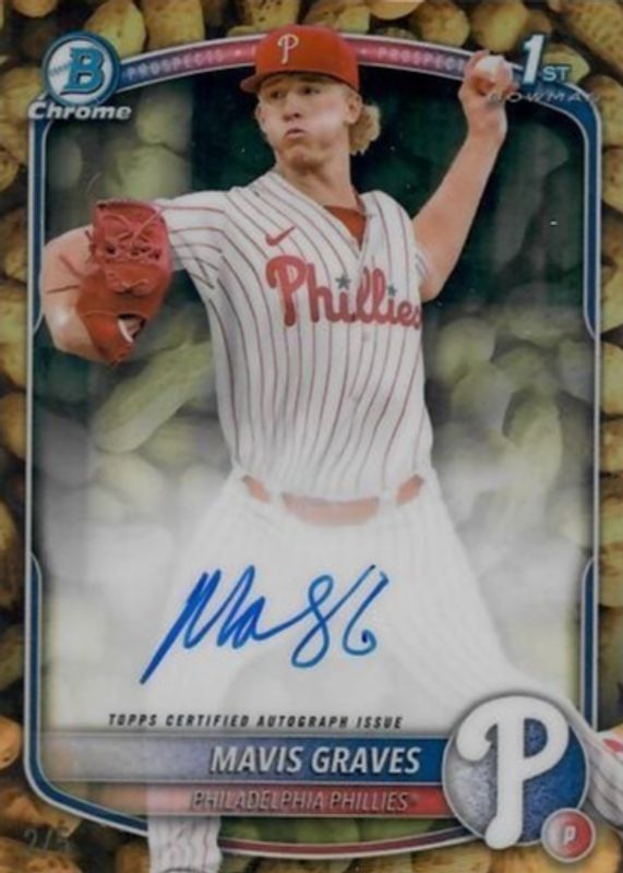 The Mavis Graves 2025 Bowman Chrome #CPA-MG Prospect Auto - Peanuts Refractor /5 (1st) card in Raw condition has not changed in price in the last 30 days and was last sold for $195.00 .