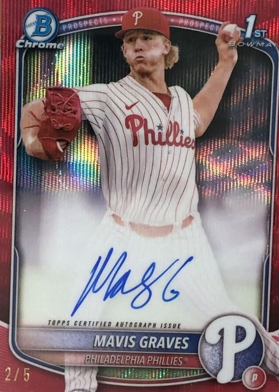 The Mavis Graves 2025 Bowman Chrome #CPA-MG Prospect Auto - Red Wave Refractor /5 (1st) card in Raw condition has not changed in price in the last 30 days and was last sold for $205.00 .
