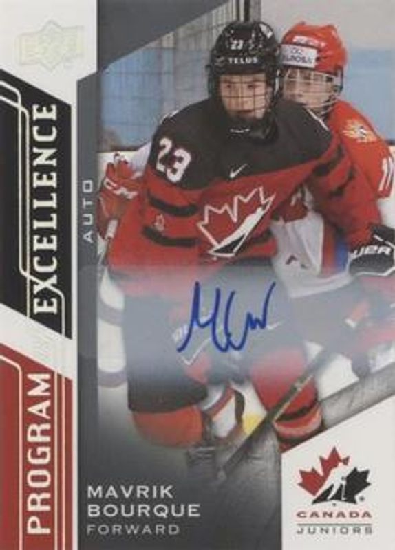 The Mavrik Bourque 2020 Upper Deck Team Canada Juniors #133 Autographs card is 1 of 33 Mavrik Bourque's card variations in the 2020 Upper Deck Team Canada Juniors set being tracked by Sports Card Investor, including #12 Base, #79 Base, #133 Base, #79 Exclusives /165, and #133 Exclusives /165.