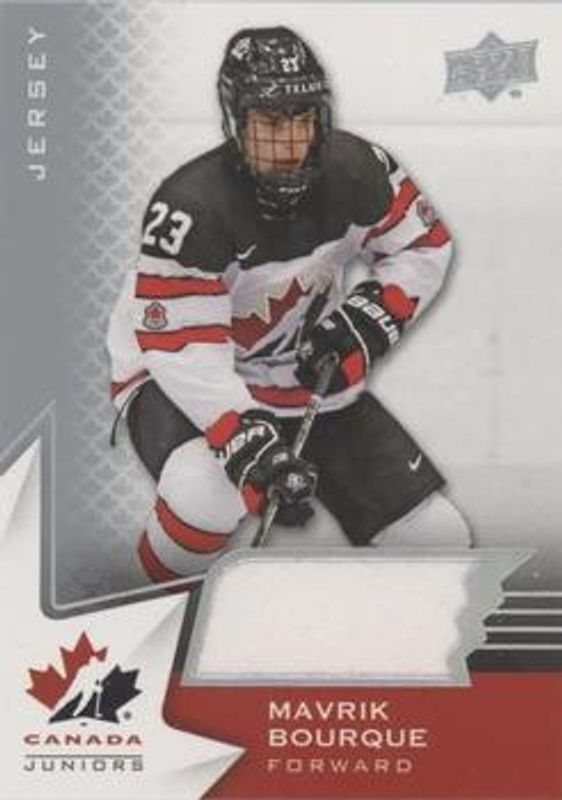 The Mavrik Bourque 2020 Upper Deck Team Canada Juniors #12 Jerseys card is 1 of 33 Mavrik Bourque's card variations in the 2020 Upper Deck Team Canada Juniors set being tracked by Sports Card Investor, including #12 Base, #79 Base, #133 Base, #79 Exclusives /165, and #133 Exclusives /165.