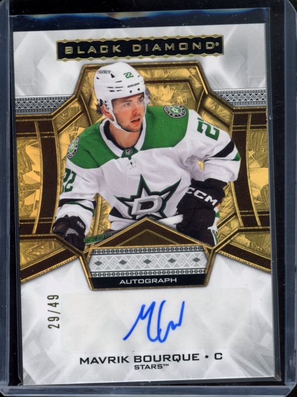 The Mavrik Bourque 2024 Upper Deck Black Diamond #BDB-BQ Autographs /49 Rookie card is 1 of 37 Mavrik Bourque's card variations in the 2024 Upper Deck Black Diamond set being tracked by Sports Card Investor, including Base /349, Diamond Relic Rookies /99, Diamond Relic Rookies Emerald /10, Emerald /10, and Diamond Relics /5.