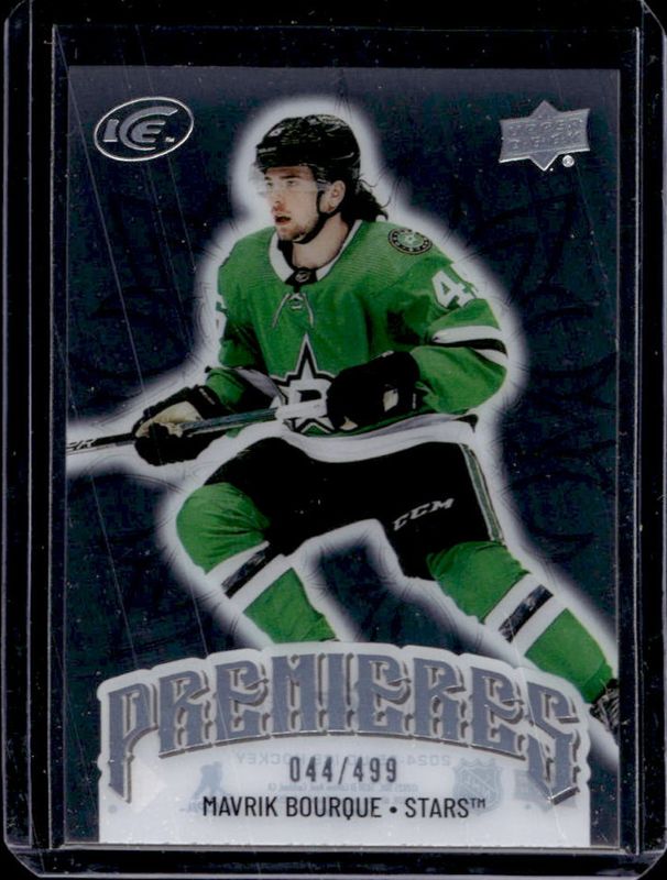 The Mavrik Bourque 2024 Upper Deck Ice #219 Base /799 Rookie card is 1 of 38 Mavrik Bourque's card variations in the 2024 Upper Deck Ice set being tracked by Sports Card Investor, including Base /799, Jersey, Purple, White Snowflake Autographs, and Blue /399.