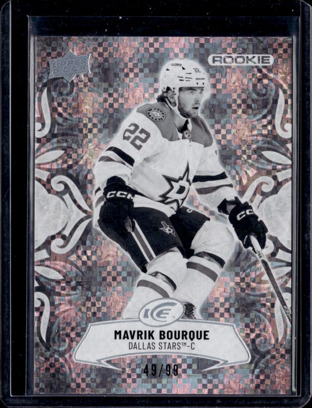 The Mavrik Bourque 2024 Upper Deck Ice #129 Grayscale /99 Rookie card is 1 of 38 Mavrik Bourque's card variations in the 2024 Upper Deck Ice set being tracked by Sports Card Investor, including #219 Base /799, #129 Base /799, #129 Jersey, #129 Purple, and #129 White Snowflake Autographs.