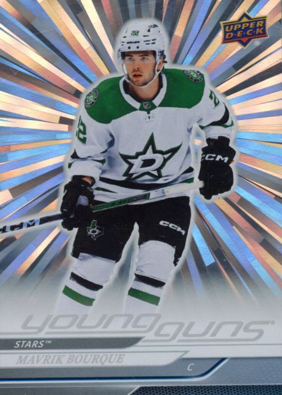 This card is 1 of 8 Mavrik Bourque's card variations in the 2024 Upper Deck set being tracked by Sports Card Investor, including Young Guns Base, Young Guns - Clear Cut, Young Guns - Deluxe /250, Young Guns - UD Exclusives /100, and Young Guns - Outburst Red /25.