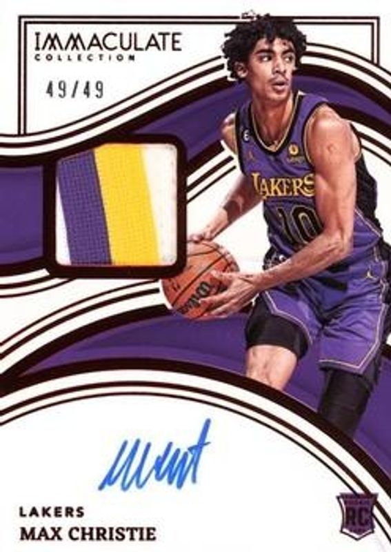The Max Christie 2022 Immaculate #102 Red /49 Rookie card is 1 of 28 Max Christie's card variations in the 2022 Immaculate set being tracked by Sports Card Investor, including Base /99, Gold /10, Premium Patch Autographs, Premium Patch Autographs - FOTL, and Premium Patch Autographs - Gold.