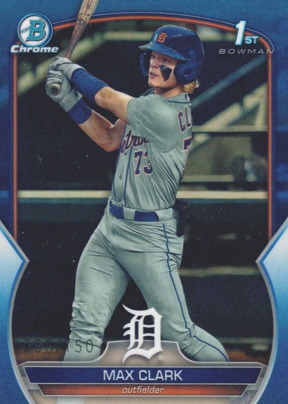 The Max Clark 2023 Bowman Draft #BDC-76 Chrome - Blue Refractor /150 (1st) card in Raw condition has not changed in price in the last 30 days and was last sold for $150.00 .