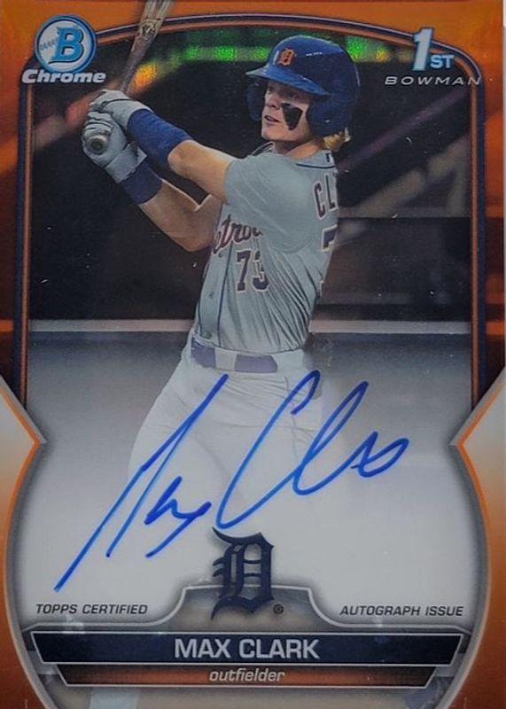 Auctions Ending Soon for Max Clark 2023 Bowman Draft #CDA-MC Chrome Prospect Auto - Orange Refractor /25 (1st) PSA 8
