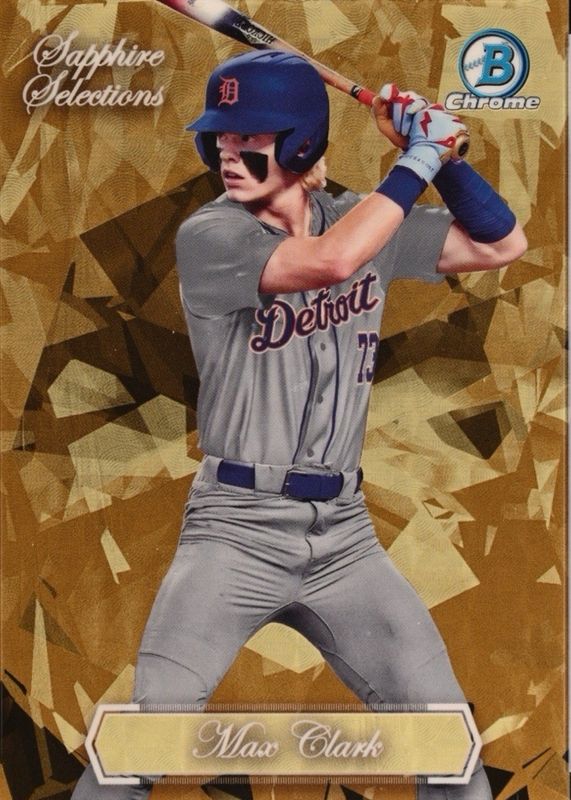 This card is 1 of 18 Max Clark's card variations in the 2023 Bowman Draft Sapphire Edition set being tracked by Sports Card Investor, including Chrome (1st), Chrome - Yellow /75 (1st), Chrome - Gold /50 (1st), Chrome - Orange /25 (1st), and Chrome - Black /10 (1st).