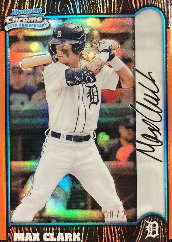 The Max Clark 2024 Bowman Chrome #BC25-20 1999 Bowman Chrome 25th Anniversary - Orange Refractor /25 card in Raw condition has not changed in price in the last 30 days and was last sold for $85.00 .