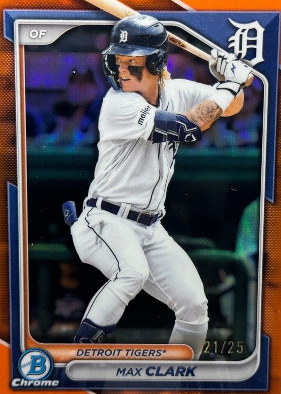 The Max Clark 2024 Bowman Chrome #BCP-195 Prospects - Orange Refractor /25 card in Raw condition has not changed in price in the last 30 days and was last sold for $24.27 .