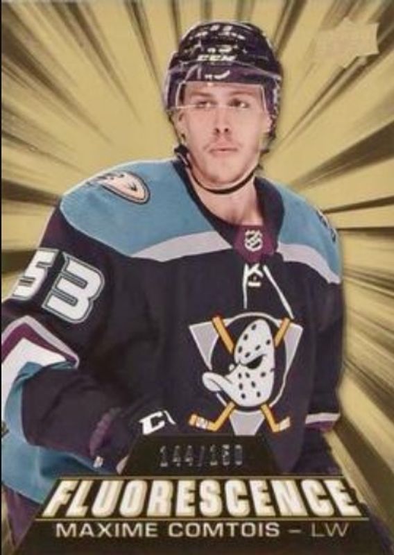 The Max Comtois 2018 Upper Deck #F-27 Fluorescence /150 Rookie card is 1 of 28 Max Comtois' card variations in the 2018 Upper Deck set being tracked by Sports Card Investor, including Young Guns Base, Young Guns Canvas, Young Guns - Clear Cut, Young Guns - Jumbo, and Young Guns - Silver Foil.