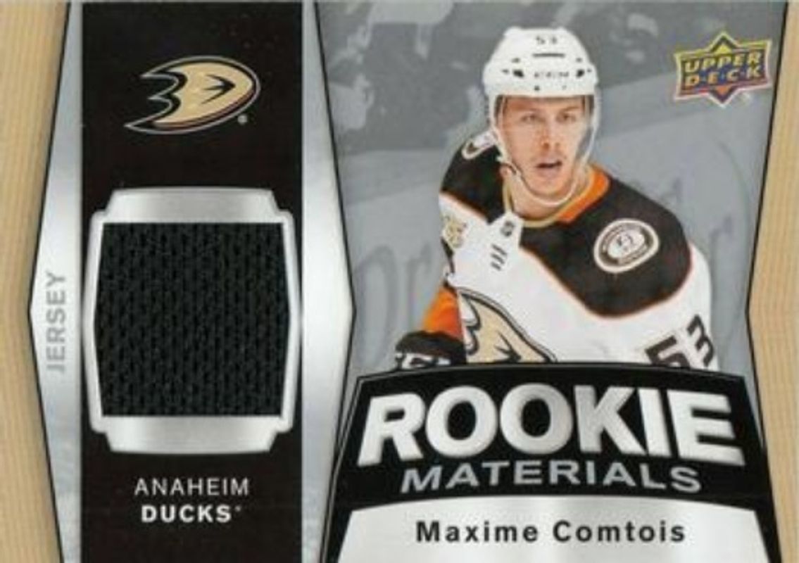 The Max Comtois 2018 Upper Deck #RM-MC Rookie Materials card is 1 of 28 Max Comtois' card variations in the 2018 Upper Deck set being tracked by Sports Card Investor, including Young Guns Base, Young Guns Canvas, Young Guns - Clear Cut, Young Guns - Jumbo, and Young Guns - Silver Foil.