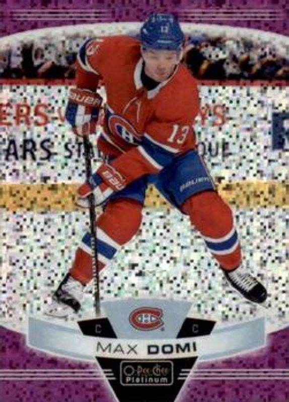 The Max Domi 2019 O-Pee-Chee Platinum #132 Violet Pixels /399 card is 1 of 12 Max Domi's card variations in the 2019 O-Pee-Chee Platinum set being tracked by Sports Card Investor, including Base, Matte Pink, Rainbow, Sunset, and Red Prism /199.
