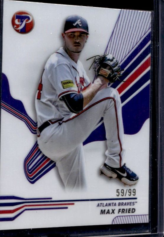 The Max Fried 2024 Topps Pristine #100 Purple Refractor /99 card is 1 of 18 Max Fried's card variations in the 2024 Topps Pristine set being tracked by Sports Card Investor, including Base, Pristine Refractor, Refractor, Green Refractor /150, and Pristine Purple Refractor /99.