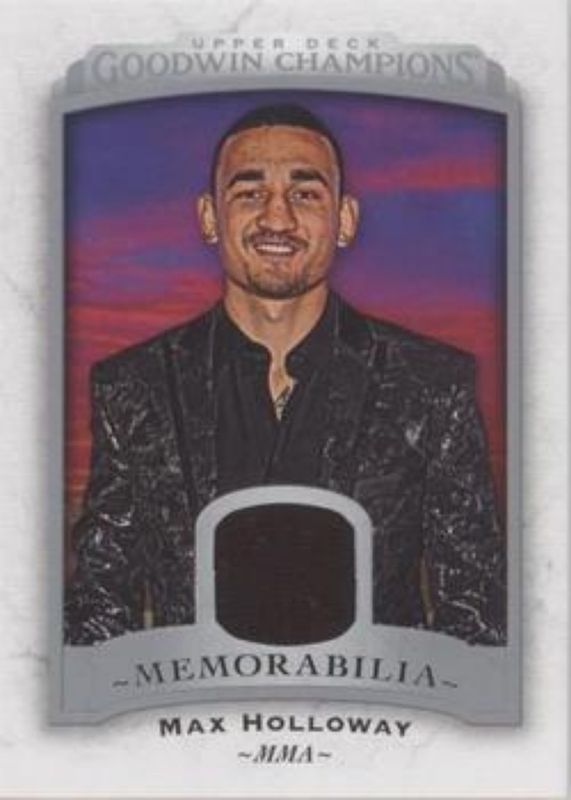 The Max Holloway 2017 Upper Deck Goodwin Champions #M-MH Memorabilia card is 1 of 61 Max Holloway's card variations in the 2017 Upper Deck Goodwin Champions set being tracked by Sports Card Investor, including #37 Base, #137 Base, #87 Base, #37b Base, and Blank Back Mini.