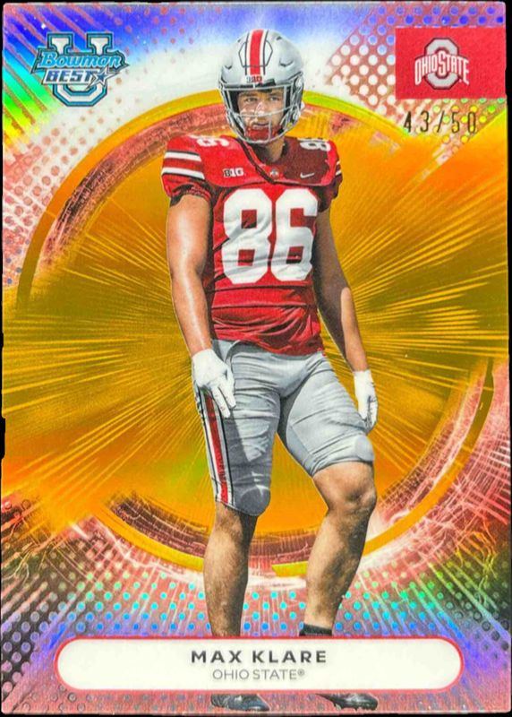 The Max Klare 2025 Bowman's Best #88 Gold Refractor /50 card is 1 of 36 Max Klare's card variations in the 2025 Bowman's Best set being tracked by Sports Card Investor, including Base, Refractor, Shimmer Refractor, Yellow Lazer Refractor /250, and Aqua Lava Refractor /199.