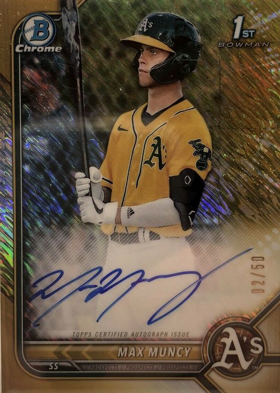 Best Prices Available For Sale of Max Muncy (Athletics) 2022 Bowman #CPA-MMU Chrome Prospect Auto - Gold Shimmer Refractor /50 (1st)