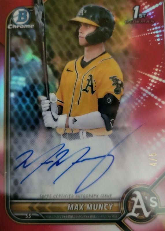 Best Prices Available For Sale of Max Muncy (Athletics) 2022 Bowman #CPA-MMU Chrome Prospect Auto - Red Refractor /5 (1st)
