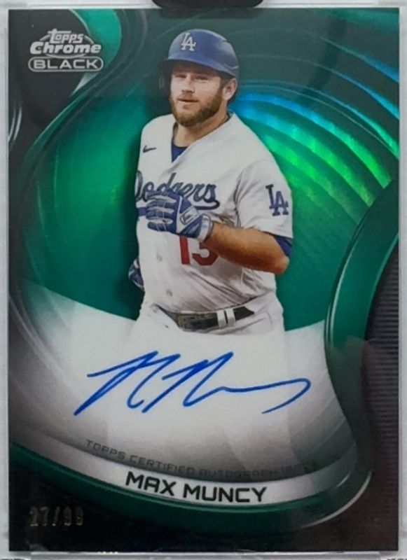 The Max Muncy (Athletics) 2022 Topps Chrome Black #CBA-MMU Autographs - Green Refractor /99 card is 1 of 8 Max Muncy (Athletics)'s card variations in the 2022 Topps Chrome Black set being tracked by Sports Card Investor, including Autographs, Autographs - Refractor /150, Autographs - Gold Mini Diamond Refractor /50, Autographs - Gold Refractor /50, and Autographs - Orange Refractor /25.